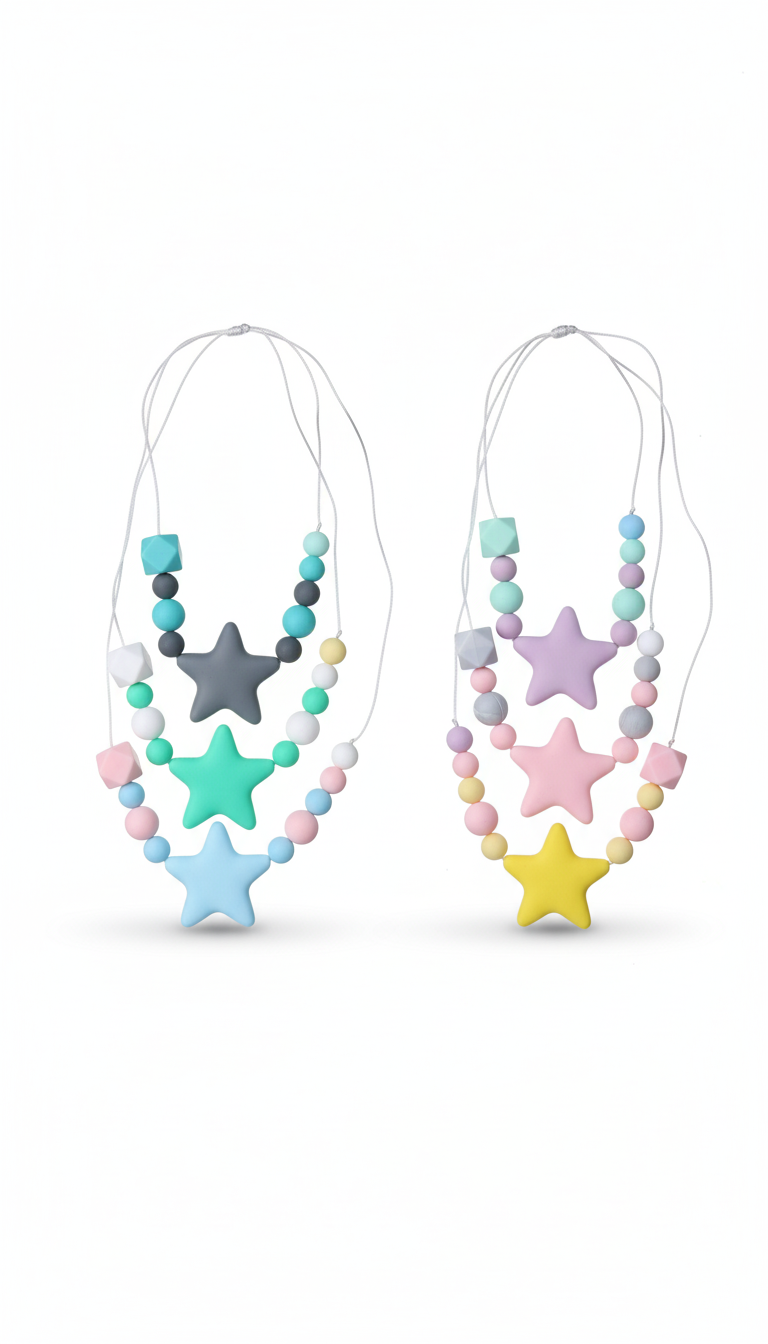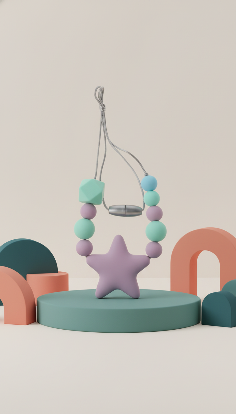 Colar sensorial desenvolvido para oferecer estímulo oral motor e suporte durante a fase de dentição. Confeccionado em silicone de grau alimentar, este acessório combina funcionalidade e estética, proporcionando uma ferramenta de apoio para autorregulação e desenvolvimento de habilidades orais motoras em bebês e crianças.
